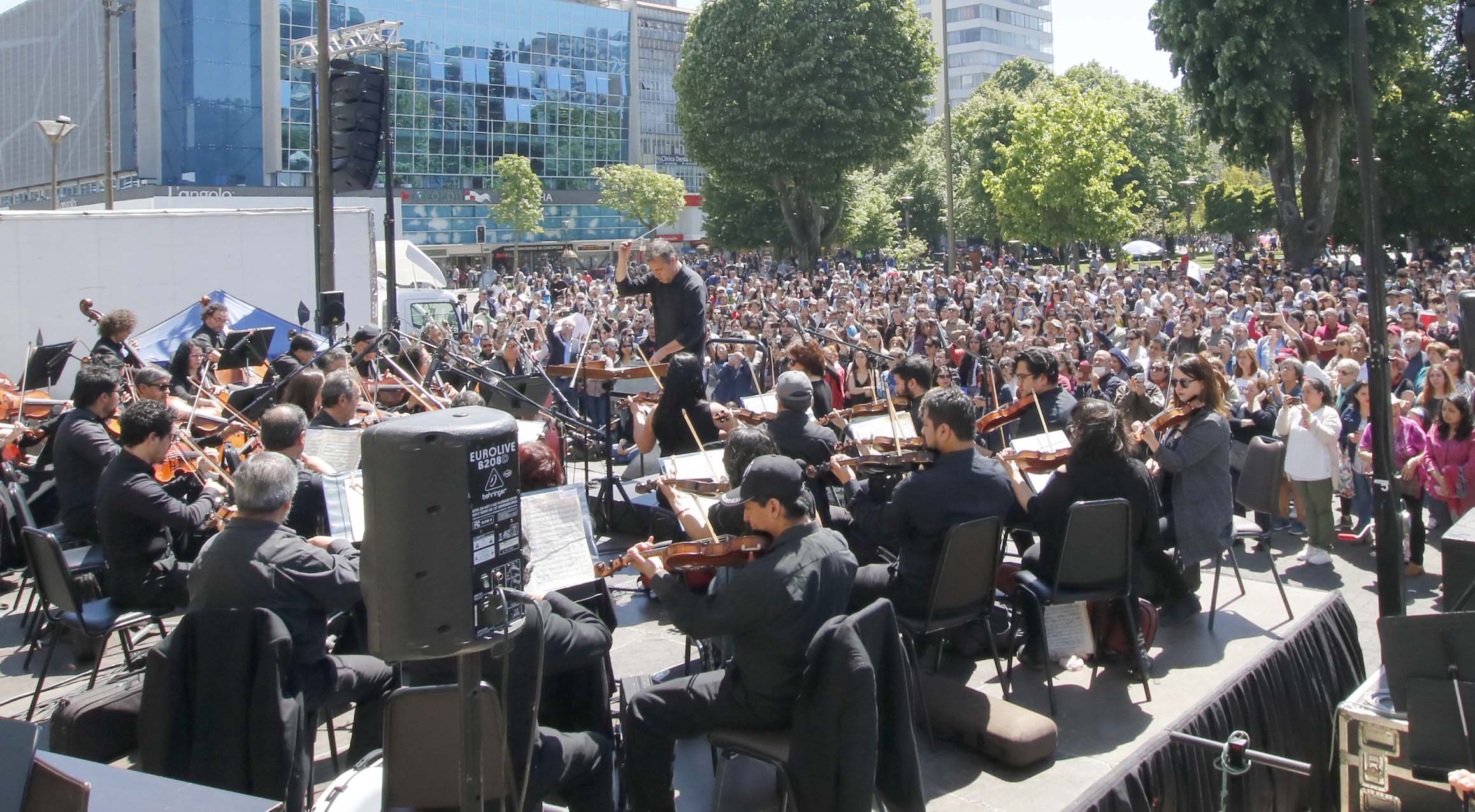 El frontis de la Catedral fue el escenario de la presentación a cargo de la Orquesta Sinfónica, el Coro de la UdeC -acompañado por voces de otras agrupaciones corales- y el cantante Feliciano Saldías, unidos para expresar su apoyo al movimiento social.